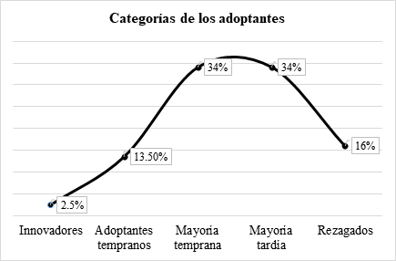 El ya mencionado Rogers realizó un estudio exhaustivo para establecer los principios fundamentales de la TDI. Una de sus contribuciones clave fue la categorización de la población potencial de adoptantes en cinco categorías distintas, basándose en la predisposición al adoptar una innovación. Rogers las clasifica de la siguiente manera: (a) innovadores, (b) adoptantes tempranos, (c) mayoría temprana, (d) mayoría tardía y (e) rezagados. Rogers asignó porcentajes aproximados a cada una de estas categorías, reflejando su grado de apertura y la velocidad con la que tienden a incorporar nuevas ideas o tecnologías (Figura 1).