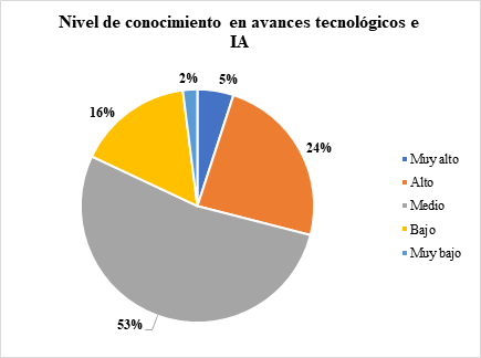 En primera instancia, los resultados de la encuesta presentan que 53% de los docentes consideran tener un nivel de conocimiento “medio” sobre los avances tecnológicos relacionados con IA, y sólo un 29% se ubica en un nivel “alto y muy alto”. Estos datos expuestos son positivos frente al conocimiento sobre el tema. En las entrevistas, algunos participantes muestran una profunda comprensión acerca de la IA, describiéndola como un “sistema algorítmico” y una “herramienta informática”, cuyo principal fin es el de procesar información, analizar datos, entre otros.