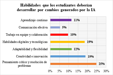 Es notable que, mientras la encuesta destacó las habilidades digitales y tecnológicas (19%), las entrevistas sugieren un enfoque más detallado. Algunos docentes, como el de la Facultad de Ciencias Matemáticas y Físicas, enfatizaron la importancia de habilidades técnicas específicas: “Más allá de inteligencia artificial, es importante manejar programación” (comunicación personal, 8 de julio de 2024). Sin embargo, otros entrevistados se enfocaron más en las habilidades cognitivas y sociales que complementan, en lugar de competir, con las capacidades de la IA.