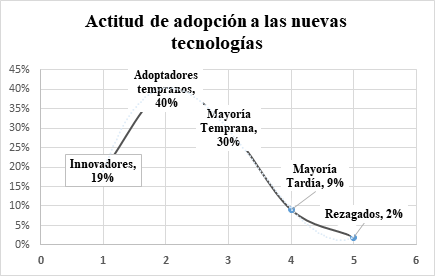La curva resultante de los resultados de la encuesta es asimétrica, con un sesgo hacia la izquierda, diferente a como se muestra en la Figura 1 de la curva de campana simétrica tradicional de Rogers. El sesgo hacia la izquierda muestra un nivel de adopción más temprana, en comparación con la curva original de Rogers, en donde se encuentra una mayor pronunciación de la curva entre los adoptadores tempranos y la mayoría temprana, dejando a la categoría de innovadores en un nivel menor.