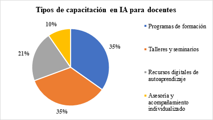 Los resultados de la encuesta muestran una preferencia de los docentes por métodos de capacitación estructurados y presenciales para incorporar la IA en su práctica. Los programas de formación y los talleres y seminarios son igualmente valorados, liderando las preferencias. Esta distribución sugiere que los educadores valoran la interacción y el aprendizaje guiado al abordar nuevas tecnologías, aunque también hay apertura hacia métodos de aprendizaje más flexibles y autónomos.