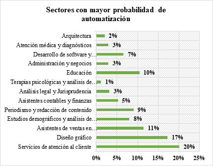 Los docentes de la educación superior destacan áreas como el servicio de atención al cliente, el diseño gráfico y la educación como altamente susceptibles de entrar en un proceso de automatización (Figura 7).