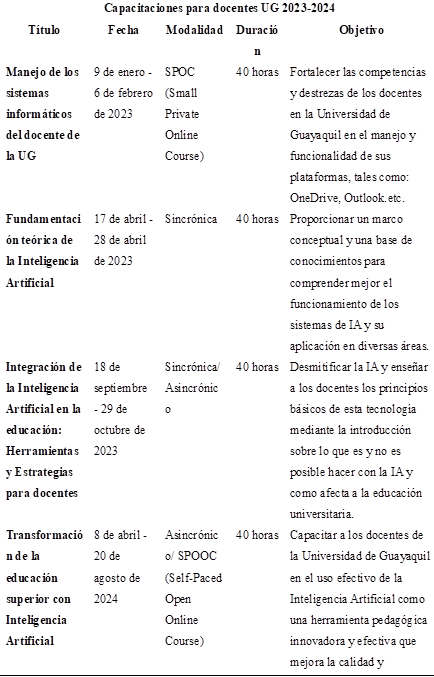 Entre las capacitaciones que se han podido identificar, mediante la página oficial de la red social Facebook de la Universidad de Guayaquil, dirigidas para docentes y efectuadas durante el periodo 2023-2024, se encuentran las siguientes (Tabla 1):