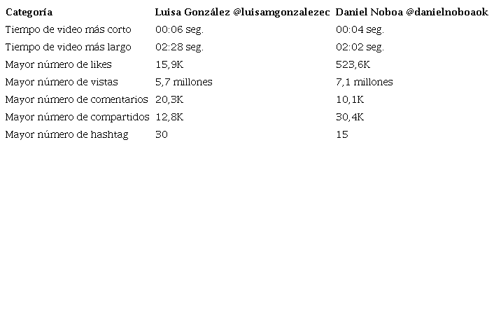 Por otra parte, en este análisis de contenido también se incluyó el analizar las métricas y feedback con las cuentas de TikTok de los candidatos Noboa y González (Tabla 11). Ante lo expuesto, se demuestran datos significativos como: tiempo de videos, número de vistas, likes, comentarios, compartidos y hashtag. La diferencia del video más corto entre ambos candidatos es de 2 segundos, mientras que el video más extenso la diferencia es 26 segundos, difundido por González. Con respecto a los likes (“me gusta”), las vistas y reproducciones de Noboa supera a la otra candidata.