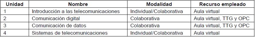 Con base en el programa de clase, la unidad de competencia establece que el estudiante analiza los sistemas de comunicaciones electrónicos mediante el desarrollo de prácticas con hardware y software que fortalezcan los conocimientos sobre las bases conceptuales de los principios en telecomunicaciones. En este sentido, las sesiones se dividieron en teóricas y prácticas, de modo que para estas últimas diseñamos actividades didácticas fundamentadas en el enfoque del trabajo colaborativo y encaminadas al uso de herramientas digitales para el reforzamiento de su aprendizaje. Dichas actividades se centraron en cuatro unidades temáticas de la experiencia educativa (ver tabla 1).