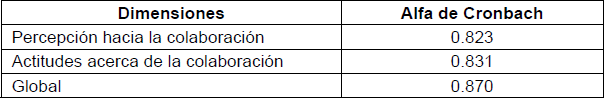 La confiabilidad del instrumento se determinó con el alfa de Cronbach, por factor (dimensiones) y el global del cuestionario. Se obtuvieron índices de consistencia bastante aceptables (ver tabla 2), que oscilan entre el intervalo de 0.8 a 1 y se consideran como niveles altos; en consecuencia, denotan un buen índice de fiabilidad (Bisquerra, 2009).