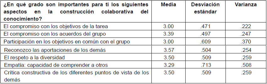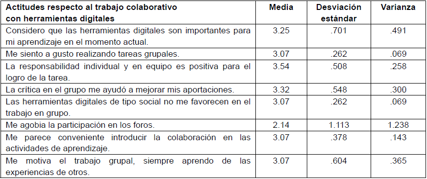 Los resultados de las medias obtenidas en las actitudes acerca de la colaboración (ver tabla 4) revelan una actitud positiva en cuanto a la utilización de las herramientas digitales, toda vez que influyen como parte complementaria en su formación académica. Esto se refleja en sus respuestas, ya que entienden el enfoque del trabajo colaborativo como una dinámica que les posibilita compartir ideas, opiniones y conocimientos acerca de un determinado tema. Asimismo, se aprecia la motivación hacia las tareas colaborativas, al comprender que la base de la organización corresponde a la responsabilidad individual y de grupo en vías del éxito de la tarea compartida.