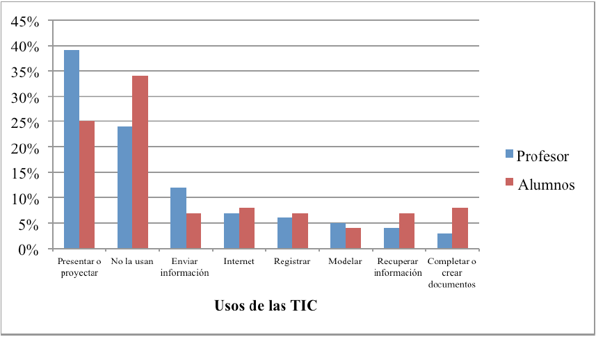 Además, sólo una planta docente ha incorporado a sus procesos de enseñanza escasos elementos de las TIC. La mayoría recurre a herramientas para presentaciones o al procesador de textos y, en contadas excepciones, se utilizan otras herramientas que, en general, los propios profesores no dominan o no emplean en su cotidianidad (Flores et al., 2009).