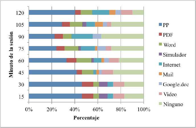 Durante las sesiones, las TIC son utilizadas tanto por profesores como por alumnos. En la gráfica 1 se muestra para qué usan, alumnos y docentes, las herramientas a lo largo de las sesiones observadas. En el análisis identificamos ocho formas de emplear las TIC disponibles dentro del laboratorio. La mayor parte del tiempo (39%) el profesor recurre a las herramientas sólo para proyectar información a los alumnos. En este caso, el uso que hacen los alumnos no se vincula de modo necesario a una actividad concreta que deben resolver. En ocasiones, sólo siguen la presentación que hace el docente en los monitores que tienen en sus mesas de trabajo. En menor proporción, y principalmente a la mitad de una sesión, las herramientas se emplean para enviar algún tipo de información a los estudiantes. Por último, destaca el porcentaje (24%) en que el docente no maneja la tecnología.