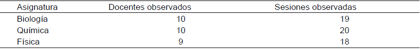 El cuestionario se aplicó antes de las sesiones de observación y fue respondido por 25 docentes. Por lo que toca a las observaciones, registraron 57 clases dentro de los nuevos laboratorios (ver tabla 2); en cada caso (excepto uno) se observaron dos sesiones de clases continuas del mismo grupo a fin de tener un panorama más completo de cómo se desarrolla un tema en el laboratorio. Las sesiones observadas fueron filmadas para tener un registro visual del trabajo en el nuevo espacio.