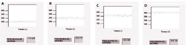 Simulaciones que muestran la frecuencia de disparo producidas al incrementar las dosis de ácido quiscuálico. (A) Respuesta de 118.40 Hz a una concentración de 3.1 mM. (B) Respuesta de 212.17 Hz con una concentración de 10.1mM. (C) Respuesta de 353.34 Hz con 20.2 mM. (D) Respuesta de 449.18 Hz con 48.3 mM.