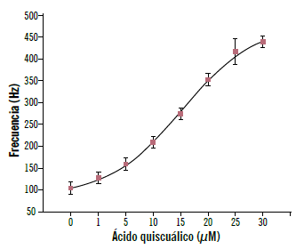 La dosis del fármaco se incrementó en cada simulación y se realizaron treinta registros a nueve concentraciones diferentes para obtener la media y la desviación estándar correspondiente. La curva se ajusta a una función sigmoidal. La frecuencia llega a un máximo, indicativo de que el receptor se ha saturado (gráfica presentada en el artículo de un alumno).