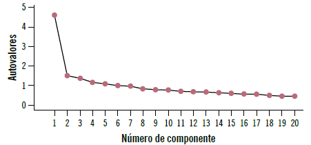 La figura representa la agrupación de los factores a través de la sedimentación de componentes que justifica la selección de seis factores (con valores mayores de 1); algo que ya se había originado al fijar el criterio de auto valor en la unidad.