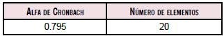 El primer proceso de validación aplicado fue el cálculo del alfa de Cronbach por medio del paquete SPSS. El resultado obtenido fue de 0.795 (bueno) (ver tabla 1), lo cual nos indicó la fiabilidad del instrumento.