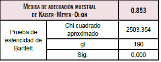 Luego, procedimos a la aplicación del método de componentes principales, los índices de KMO (0.853) y la prueba de Bartlett con significancia (p=0.000), que indican que el modelo es apropiado y no presenta esfericidad (ver tabla 2), es decir, se acepta H0 (hipótesis nula); por tanto, se puede aplicar el análisis factorial.