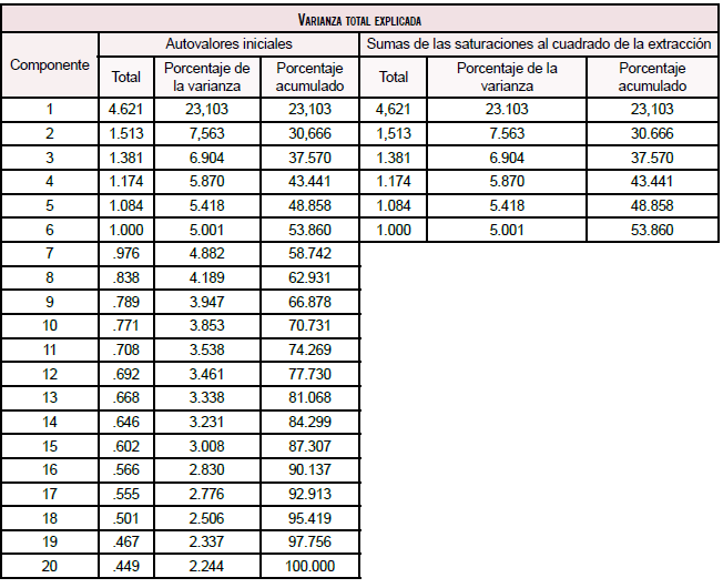 Con base en el criterio de los auto valores mayores de 1, obtuvimos seis factores que explican 53.86% de la varianza. Al aplicar el método de extracción de componentes principales en el análisis factorial, los resultados fueron los que presentamos en la tabla 3.