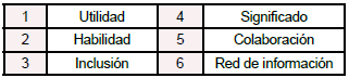 componentes: utilidad, habilidad, inclusión, significado, colaboración y red de información, que aluden a los pasos que desde el conectivismo se proponen para comprender la inclusión de las TIC en las acciones de aprendizaje de los estudiantes universitarios.