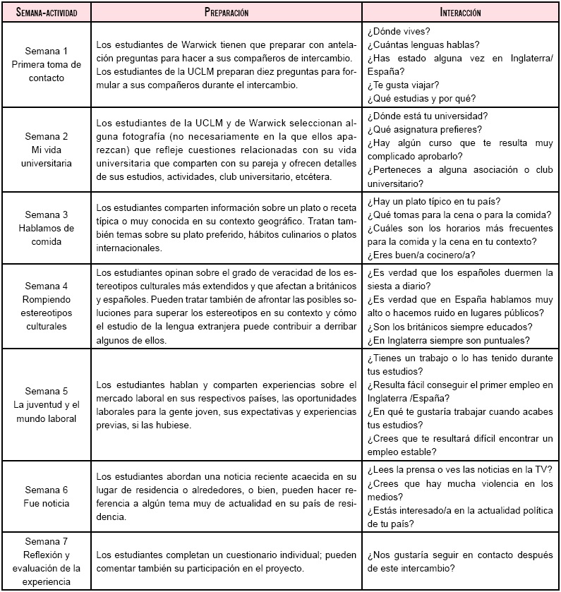 Las consideraciones expresadas constituyen el punto de partida para el desarrollo de un proyecto docente interinstitucional entre la Universidad de Warwick en Reino Unido y la Universidad de Castilla-La Mancha (UCLM) en España, cuyos objetivos principales son mejorar las destrezas comunicativas en lengua inglesa (español/inglés) buscando nuevos contextos y oportunidades para practicar y conseguir que los estudiantes sean conscientes de la cultura meta a través de los intercambios virtuales orales y escritos.