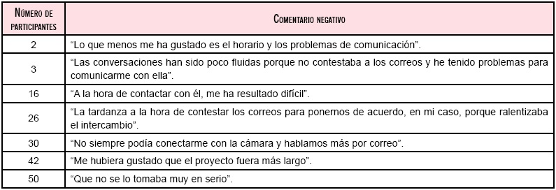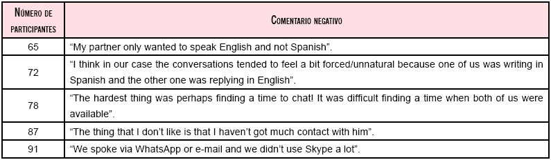 En referencia a los datos más negativos formulados por los participantes, encontramos cuestiones espacio-temporales: hora de conexiones y la duración de estas; en su mayoría, estos escasos comentarios negativos revelaron que no siempre fueron capaces de encontrar un momento apropiado para el intercambio conversacional. Otros aspectos vinculados al compromiso de los estudiantes y su voluntad para participar activamente también fueron recogidos; sin embargo, se trata de dos casos aislados que no resultan significativos y que coinciden con los estudiantes que no entregaron las tareas asociadas al proyecto.