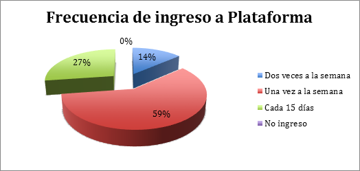 Como observamos, 59% ingresan una vez a la semana, 27%, cada quince días y 14%, dos veces a la semana; esto significa que un poco más de la mitad de la población demuestra una frecuencia semanal de revisión de la plataforma. Las sesiones presenciales de la asignatura se realizan dos veces por semana, con una duración de una hora con cuarenta minutos cada una; con base en los resultados identificados, si los estudiantes ingresan a la plataforma durante la semana, es evidente que se fortalecen los procesos de comunicación entre ellos y se profundiza la revisión de los contenidos.