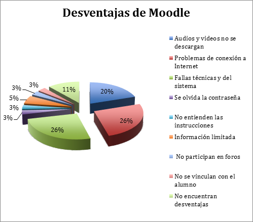 Las tres desventajas del uso de la plataforma estriban en un factor externo al curso. Las fallas técnicas y del sistema, los problemas de conexión a internet, y que los videos y audios no se descarguen obtuvieron 26, 26 y 20%, respectivamente. Si los sumamos, llegan a 62%, hecho que los ubica como el problema más trascendente como respuesta. Esta elección de los estudiantes revela que casi no hay pormenores sobre el curso vinculado con la plataforma, pero sí los hay en la parte técnica de control del sistema que sustenta Moodle.