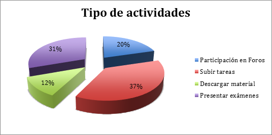 El tipo de actividades que ejecutan los estudiantes son principalmente cuatro: la más importante es la elaboración de tareas y, por tanto, el subir archivos con el producto solicitado. La segunda es la presentación de exámenes, y entre la primera y esta suman 68% de frecuencia de actividades. Esto es determinado, desde luego, por el diseño del curso que el docente de la asignatura propuso, y puede darnos noción que al menos estas dos actividades, entregar tareas y presentar exámenes, que en un curso convencional requerirían tiempo presencial, ahora dejan espacio para el desarrollo de la asignatura en el aula, ya sea para mayor profundización en algún contenido o para el análisis de ciertas obras.