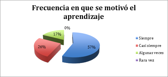 Lo adicional a la información que especifica la gráfica 3 sobre el nivel de motivación de los estudiantes para el uso de la plataforma en relación con su aprendizaje lleva a considerar también que 83% (suma de las respuestas “siempre” con “casi siempre”) valora el recurso en línea no como un complemento, sino como un aliciente, pues los estudiantes utilizan las TIC a diario en los diferentes contextos donde se desenvuelven; por ello, emplearlas en el desarrollo de su asignatura constituye una motivación significativa. El modo como se diseñan las actividades, la distribución de contenidos y la selección de materiales desempeñan un papel relevante también que se refleja en estas estadísticas.