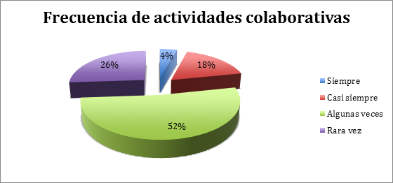 Sin embargo, esta forma de trabajo no se favorece en los hallazgos de la investigación, ya que la mayoría señala solo con “algunas veces” la realización de tareas en esta modalidad, lo cual lleva a pensar en reforzar y plantear actividades que fortalezcan la colaboración entre los integrantes del grupo, más aún si en la misma plataforma se cuenta con herramientas como el foro y las wikis, por mencionar algunas.