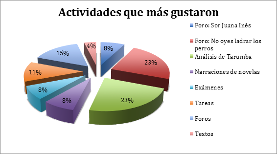 En cuanto a las actividades que más les gustan a los estudiantes en plataforma destacan dos: la participación en foros con tres opciones de respuesta; el destinado a Sor Juana tuvo una aceptación de 8%; otro dedicado al cuento de Juan Rulfo No oyes ladrar los perros, 23%, y el último llamado foro, que se refería al recurso en general, con 15%. Este recurso de comunicación abre la posibilidad de exponer ideas mediante comentarios y opiniones acerca de un tema; por ello, los estudiantes se identifican con el hecho de poder leer lo que sus iguales piensan sobre el mismo tema; les gusta confrontar su punto de vista con el de los otros, y confirmar o discutir sus ideas.