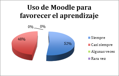 Los porcentajes de la gráfica 6 señalan con contundencia que la plataforma ayuda en el aprendizaje de los estudiantes. Con 52%, la mayoría elige el “siempre” y con 48%, el resto opta por el “casi siempre”. No hay duda de la importancia que el estudiantado otorga al uso de la plataforma Moodle como una herramienta que favorece el proceso de enseñanza-aprendizaje. Esta información consolida y reafirma lo aseverado en la estadística de preguntas.