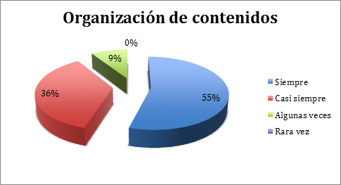 Del total de alumnos, 91% opinan que la organización de los contenidos les facilitó el aprendizaje; 55% mencionan una frecuencia “siempre” y 36%, “casi siempre”. En el recurso de plataforma subyacen los cuatro pilares de la administración: la planeación, la organización, la dirección y el control. Si bien los cuatro son necesarios, el segundo se destaca por el orden y la progresión en el contenido del curso.
