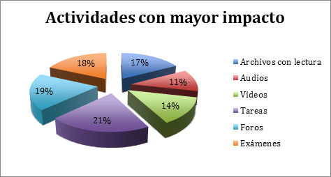 Los resultados de investigación muestran que los docentes en formación eligieron las tareas, foros y exámenes con 21, 19 y 18%, en ese orden, como aquellas actividades con mayor impacto en su aprendizaje. Las tareas, por ejemplo, son actividades trascendentes para reafirmar contenidos, reforzar temas y desarrollar competencias que difícilmente el tiempo de la clase lo permitiría. Es grato saber que en la apreciación de estos jóvenes encuestados se reconoce esa faceta de las tareas; eso sí, las diseñadas de acuerdo con un fundamento constructivista y con la intención de dosificarse y realizar una serie de pasos secuenciados para obtener un producto determinado son más significativas.