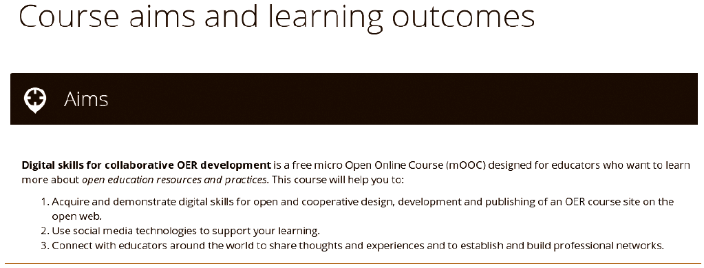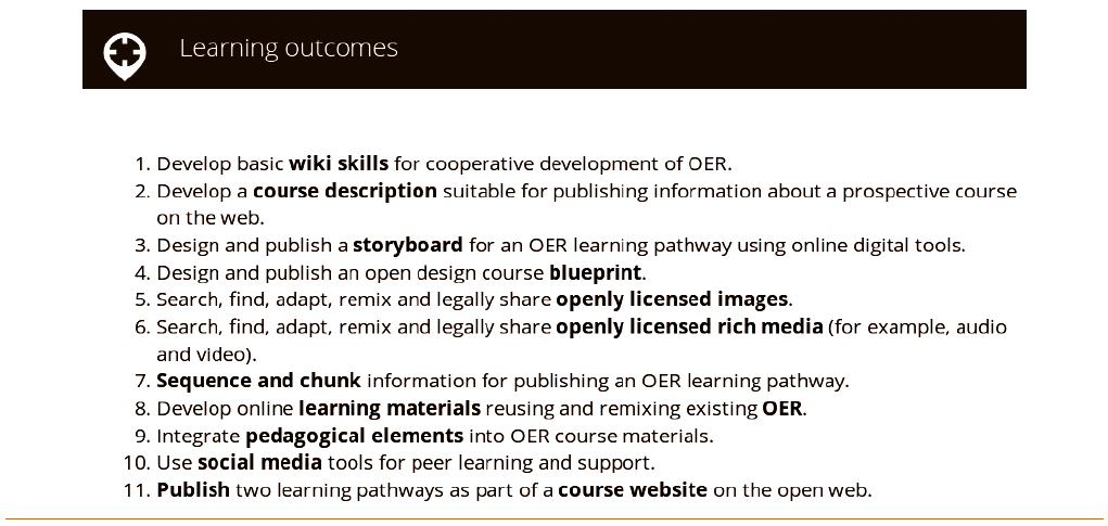 Os objetivos do curso circundam o desenvolvimento da habilidade de colaboração, a partilha em rede, a utilização de sites ou páginas de internet e a criação de comunidades online para socialização de ideias e práticas com a educação aberta (figura 10).