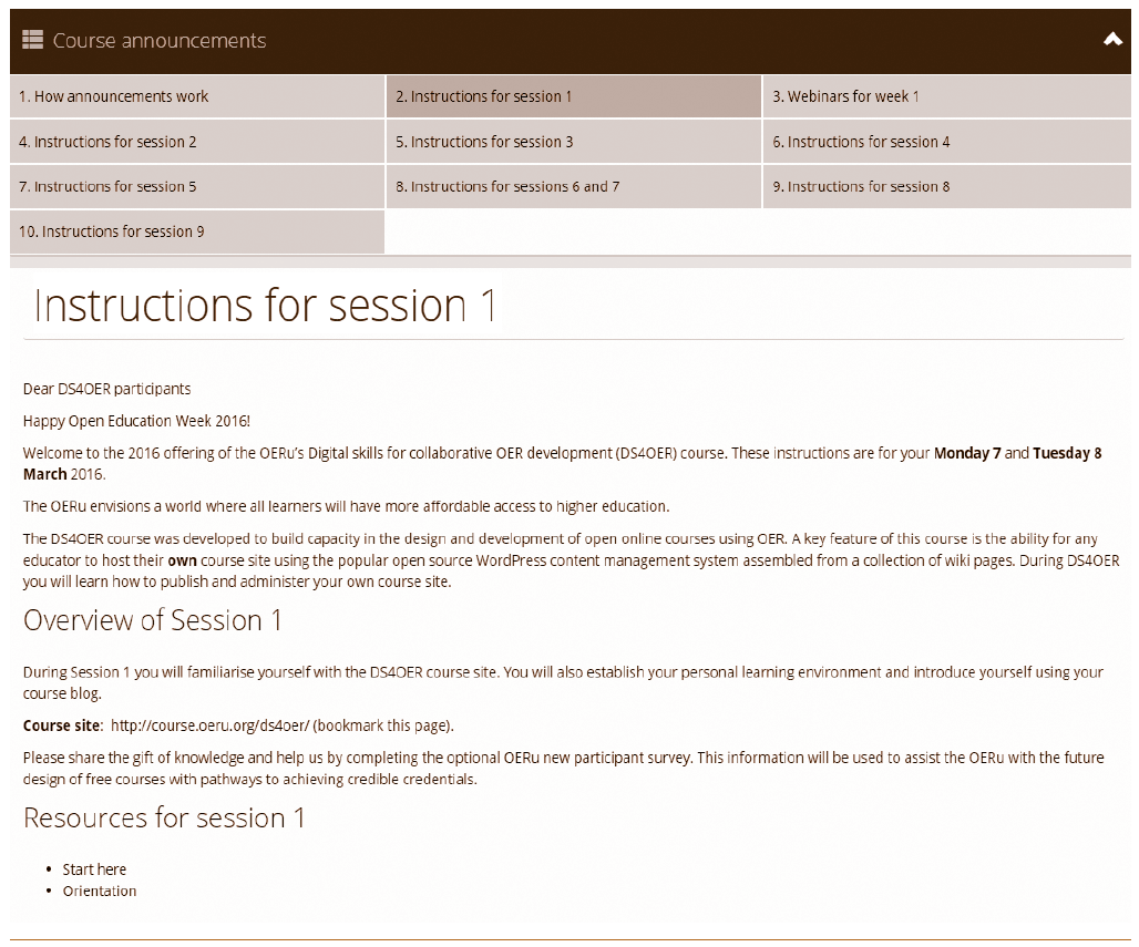 Além disso, apresentam uma lista de 11 resultados de aprendizagem (figura 11). Os materiais, recursos, hiperlinks, atividades e orientações são organizados por um facilitador que é Chair in OER pela Unesco/COL/ICDE e conta com o apoio e orientação da New Zealand National Commission for Unesco. Todas as orientações estão separadas por sessões (figura 12), conforme a organização apresentada pelo facilitador Wayne Mackintosh.