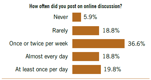 Os dados de Kolowich (2013), na figura 2, mostram que 13% dos professores assumem não responder a nenhuma mensagem de e-mail recebida dos participantes. Do mesmo modo, os professores que nunca ou raramente participam das discussões em fóruns online também é alta (figura 3).