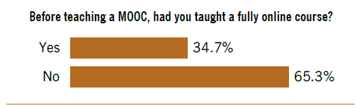 Os percentuais de Kolowich (2013) mostram que antes de atuar em MOOC, 65,3% dos 103 respondentes não possuem experiência com ensino online (figura 4).
