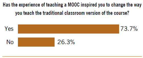 Há muitos fatores de motivação para investir em pesquisa, reflexão e criação conceitual em torno das práticas educacionais mediadas por tecnologias, incluindo nessas os MOOC, especialmente ao movimento recente dos REA. Um desses fatores é que os professores que desenvolvem experiência com docência online continuam se sentindo aptos a criar e disponibilizar conteúdos para que mais pessoas tenham acesso ao conhecimento. Do mesmo modo, indicam (figura 5) que as aprendizagens trouxeram desenvolvimento profissional que inspira inovação em práticas na modalidade de classes mais tradicionais como a presencial, por exemplo.