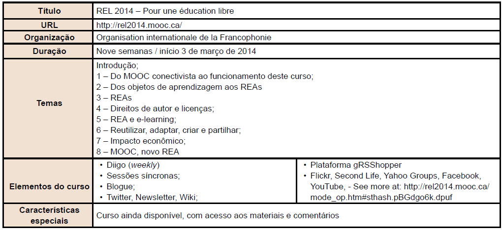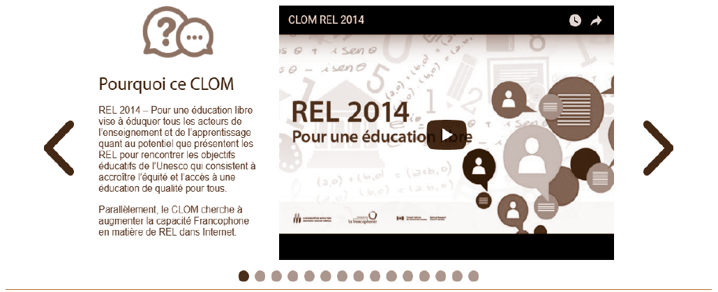 A Organisation Internationale de la Francophonie lançou no dia 3 de março de 2014 um MOOC sobre Recursos Educacionais Abertos intitulado Réutiliser, Retravailler, Recombiner, Redistribuer - 4R des REL pour une Éducation libre disponível no endereço http://rel2014.mooc.ca/ (figura 6).