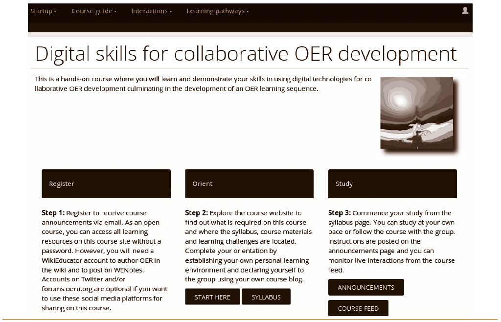 O MOOC Digital skills for collaborative OER Development (DS4OER) está disponível no endereço eletrônico: http://ds4oer.oeru.org/ e possui três passos: 1. Registro para recebimento das credenciais e avisos via e-mail; 2. Orientação para exploração do ambiente do curso, compreensão do funcionamento, conteúdos, criação de blog e acesso ao sumário do curso; 3. Estudo com sugestão de início pelo resumo dos conteúdos.