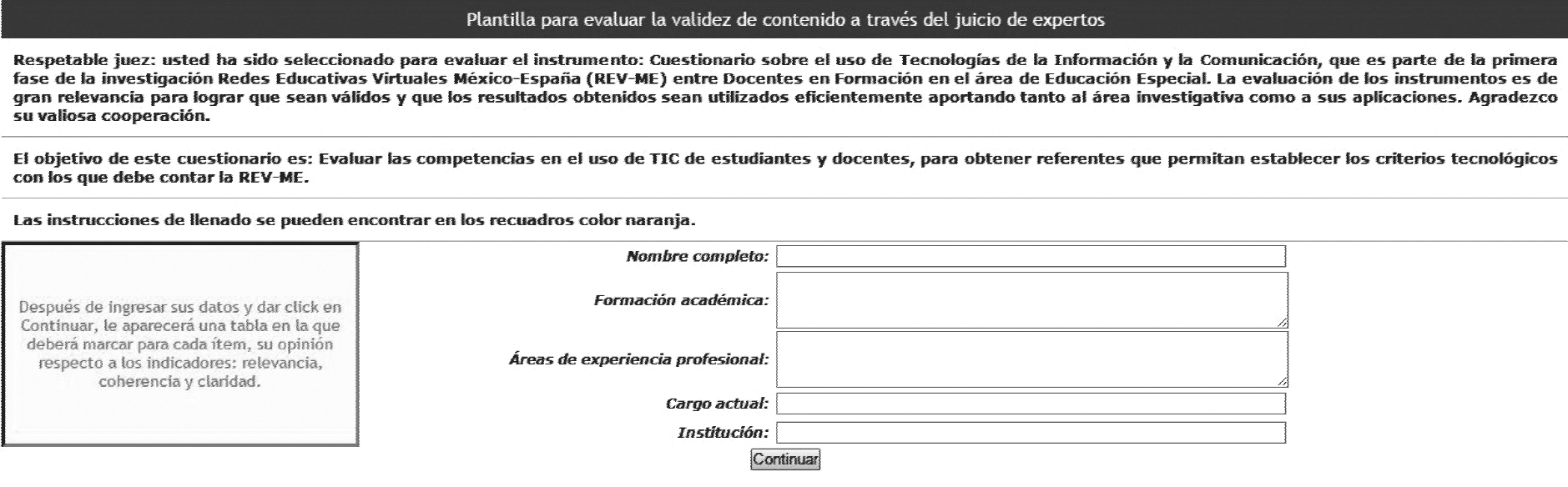 La citada plantilla considera dos pantallas para hacer más clara la explicación del proceso y se acompaña con el ejemplo de la validación de contenido de cuestionario web en la que participaron siete jueces expertos. En la primera pantalla se presenta: el nombre del instrumento a validar; la razón por la cual se le eligió como juez experto; el objetivo del instrumento; las instrucciones de llenado; y un formulario para recabar datos del juez experto. Sin embargo, esta pantalla puede contener otros datos: la población a la que se dirige; el tiempo para su validación; si el instrumento forma parte de alguna investigación en posgrado; si es la adaptación de algún otro instrumento; en fin, toda información que sirva como antecedente para el juez y que le clarifique lo que se espera de él o de su participación (ver figura 1).