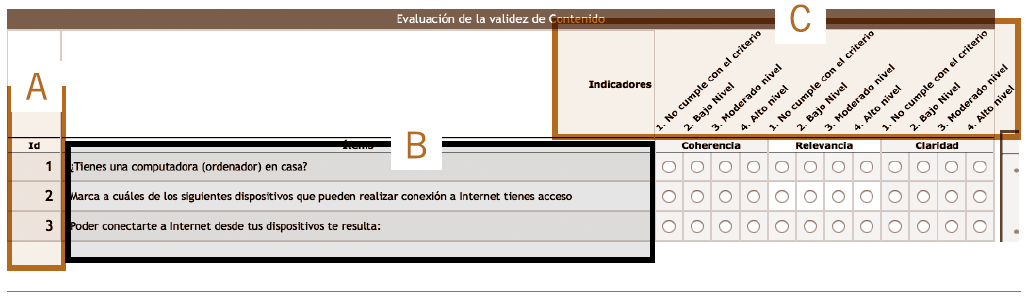La columna A sirve para identificar el número de ítem en orden ascendente y consecutivo, como se presenta en el instrumento. La B tiene escrito el ítem a valorar y la C contiene una escala del 1 al 4 para que el juez dé clic en el indicador que considere adecuado conforme a las categorías: coherencia, relevancia y claridad.
