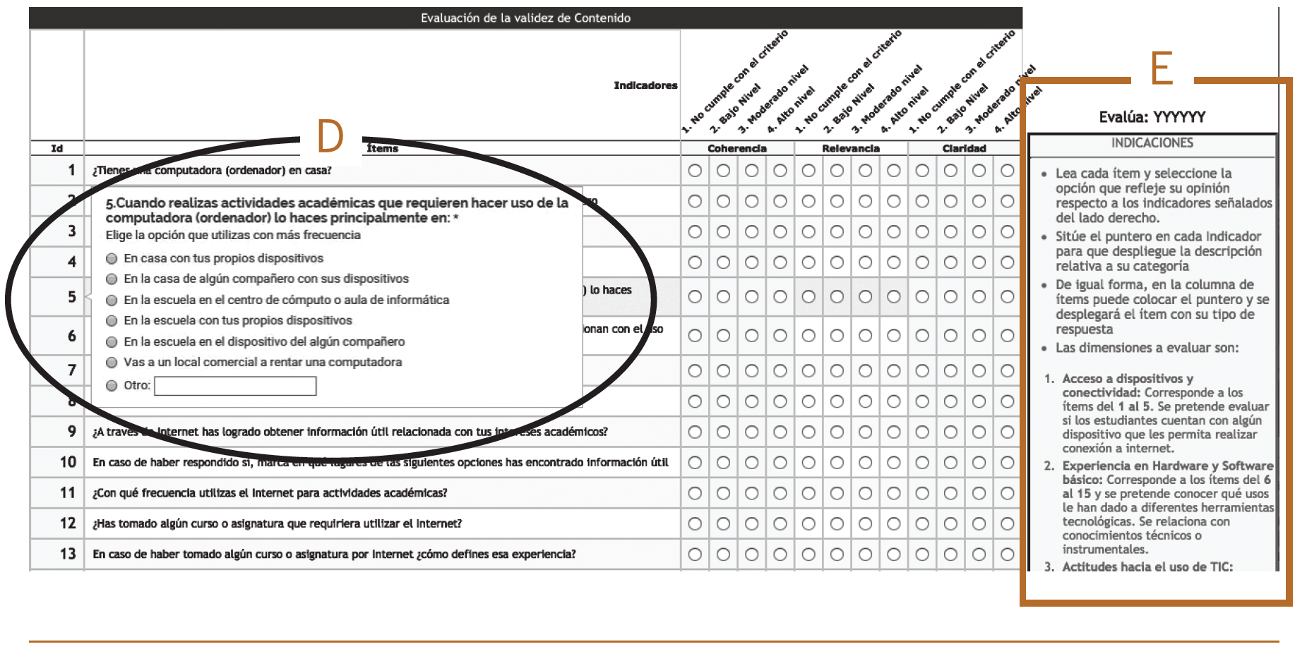 Para facilitar la evaluación de cada ítem, estos se despliegan en un tooltip al deslizar el puntero sobre la fila; de esta forma, aparece exactamente igual que en el instrumento real, lo cual resulta muy útil en los ítems de opción múltiple.