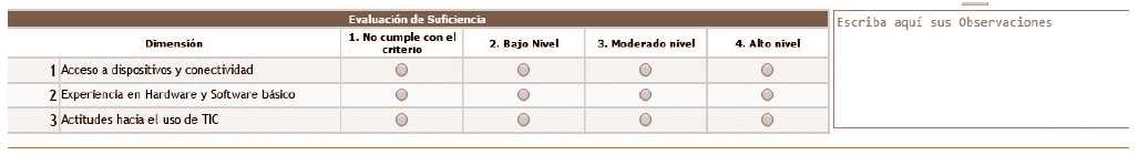 Finalmente, en virtud de que la categoría de suficiencia se evalúa por dimensión y no por ítem, este rubro se colocó al final de la segunda pantalla (figura 3), además de un espacio abierto para las observaciones (ver figura 4).