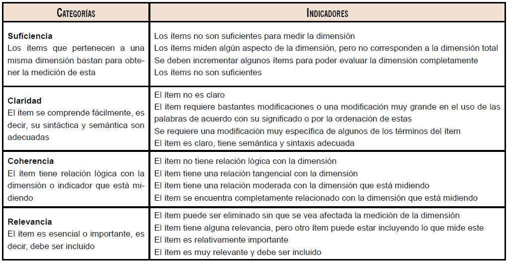 El referente metodológico para el proceso de validez se retomó principalmente de la propuesta de Escobar y Cuervo (2008), quienes elaboraron una plantilla de cuatro categorías: claridad, coherencia, relevancia y suficiencia; asimismo, definieron la validez de contenido por juicio de expertos como "una opinión informada de personas con trayectoria en el tema, que son reconocidas por otros como expertos cualificados en éste, y que pueden dar información, evidencia, juicios y valoraciones" (p. 29). De esa forma, resulta trascendente la elección de los jueces, ya que es importante dilucidar si se trata de personas conocedoras de la temática por su formación académica o su experiencia laboral. Aunado a ello, cabe considerar sus ocupaciones y concertar los tiempos para la realización de la tarea de validación.
