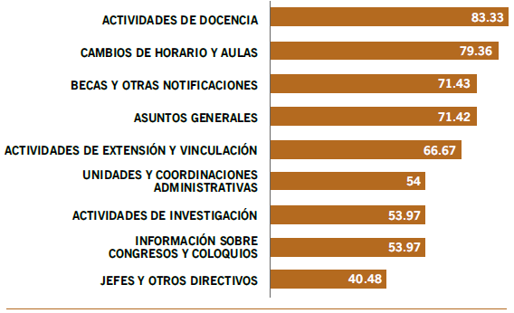 Los usos más frecuentes que reportan los docentes son los referidos a cambio de horarios y aulas, información sobre congresos y coloquios, así como becas y otras notificaciones (ver gráfica 1).