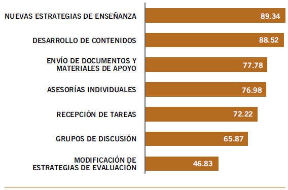 Observamos que, además de la comunicación, hay actividades que se realizan con mayor frecuencia que otras, como son el envío de materiales (77.78%), la recepción de tareas (72.22%) y las sesiones individuales de trabajo (76.98%); entre las de menor frecuencia están la dirección de tesis (38.89%), la publicación de resultados de investigación (30.16%) y el trabajo de campo (38.1%), como entrevistas y aplicación de encuestas. Aquí se recuperan otros elementos señalados por los 142 docentes participantes: