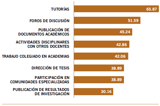 La docencia incluye diversas actividades más allá de la enseñanza, sobre todo lo que se refiere a las reuniones de academia para revisión y actualización de programas de estudio; aunque en esta investigación son pocos los docentes que utilizan Facebook para ese fin, sí desarrollan otras actividades colegiadas, como foros de discusión y trabajo en red a través de comunidades especializadas con propósitos de actualización disciplinar o pedagógica, entre otros (ver gráfica 3).