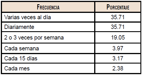 Respecto a la frecuencia de uso de Facebook, 94.5% de los docentes se conectan al menos una vez a la semana (ver tabla 1), y lo hace más frecuentemente desde su hogar (84.12%), y en segundo nivel desde su lugar de trabajo (53.97%). El dispositivo desde el cual se conectan con mayor frecuencia es la computadora portátil (68.25%), seguido por la tableta o el celular (60.32%). Cabe resaltar que la antigüedad en la docencia fue un dato significativo, ya que la mayoría de los docentes con menos de cinco años en la práctica educativa (55.56%) ingresan a Facebook varias veces al día, lo que no sucede con los profesores que tienen más de veinte años en la docencia; de estos, solo 13.3% se conectan con esa frecuencia. Sin embargo, en cuanto al uso intencionado de esta red social -actividades de docencia y de investigación-, las diferencias entre los grupos de edad no fueron significativas en ninguno de los casos.