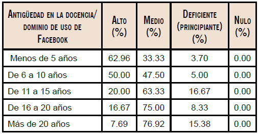 De los profesores, 90.98% se ubican entre los niveles medio y alto en el uso de Facebook y solo 9.02% se consideran principiantes en esta red social. La relación entre la antigüedad en la docencia y el dominio de uso de Facebook es significativa (p=0.00): 62.96% de los profesores que tienen menos de cinco años aseguran tener un dominio alto frente a 7.69% de profesores con más de veinte años en esta misma categoría (nivel alto) (ver tabla 2). De los docentes, 82.79% aprendieron a usar Facebook por cuenta propia, y lo que los motivó fue el ampliar la comunicación con familiares, amigos y colegas (95.09%).