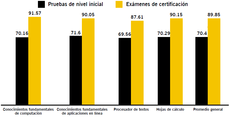 En la gráfica presentamos la comparación de los promedios generales obtenidos en las pruebas de nivel y en los exámenes de certificación, que evidencian claramente los avances y el desarrollo de las competencias digitales de los profesores que participaron en la certificación base-ICDL.